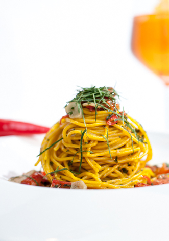hausgemachte Pasta, Cranberry, Lauch, Spinat, Ingwer-Maracuja-Sauce